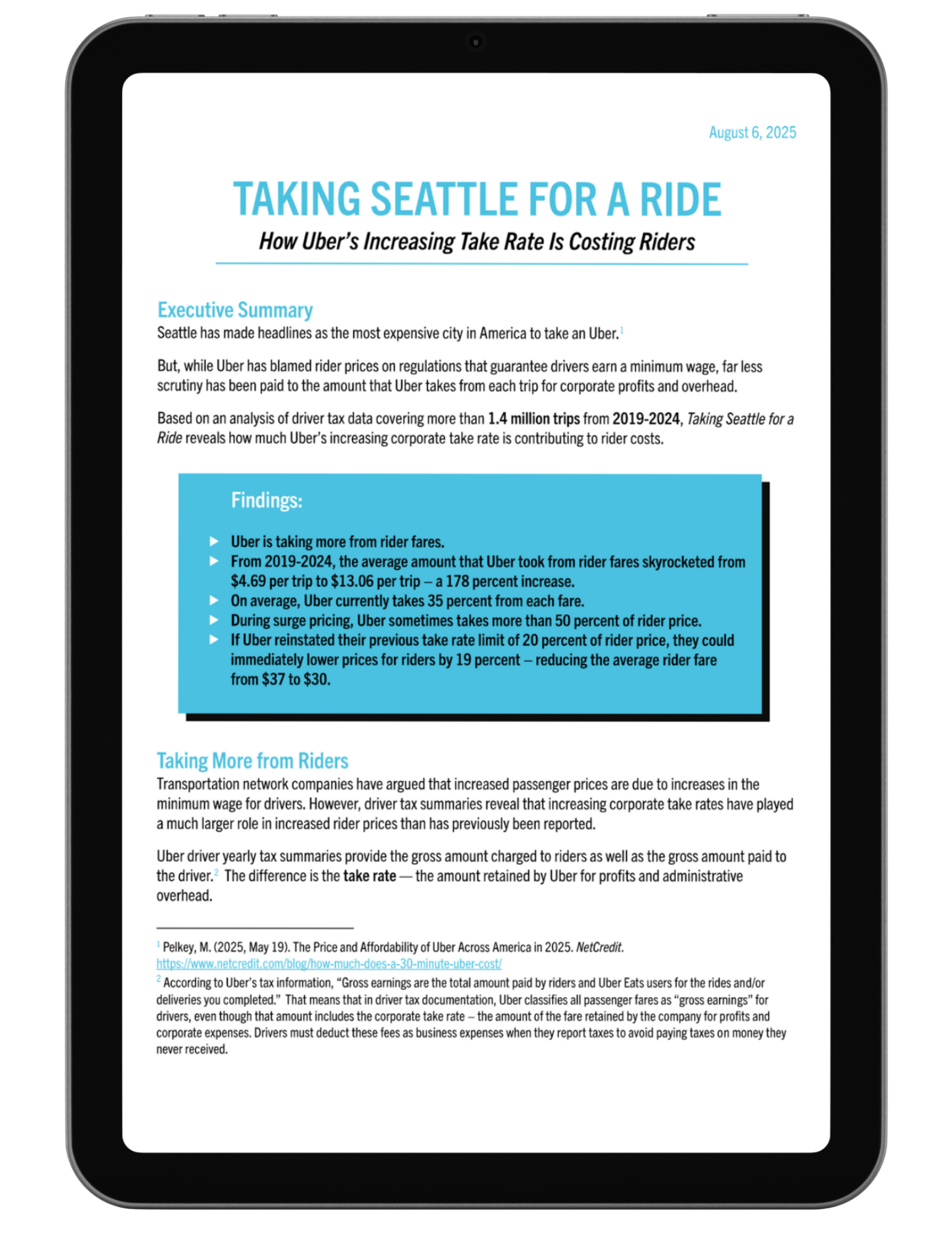 ਅੱਜ ਜਾਰੀ ਕੀਤੀ ਗਈ ਇੱਕ ਰਿਪੋਰਟ ਵਿੱਚ, ਟੇਕਿੰਗ ਸੀਏਟਲ ਫਾਰ ਏ ਰਾਈਡ , ਦੇ ਖੋਜਕਰਤਾਵਾਂ ਨੇ Drivers Union ਨੇ ਉਸ ਪੰਜ ਸਾਲਾਂ ਦੀ ਮਿਆਦ ਵਿੱਚ 1.4 ਮਿਲੀਅਨ ਤੋਂ ਵੱਧ ਯਾਤਰਾਵਾਂ ਨੂੰ ਕਵਰ ਕਰਨ ਵਾਲੇ ਡਰਾਈਵਰ ਟੈਕਸ ਡੇਟਾ ਦਾ ਵਿਸ਼ਲੇਸ਼ਣ ਕੀਤਾ। ਨਤੀਜਿਆਂ ਵਿੱਚ ਸ਼ਾਮਲ ਹਨ: